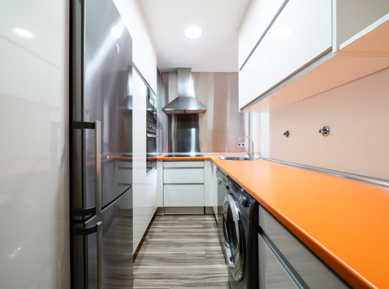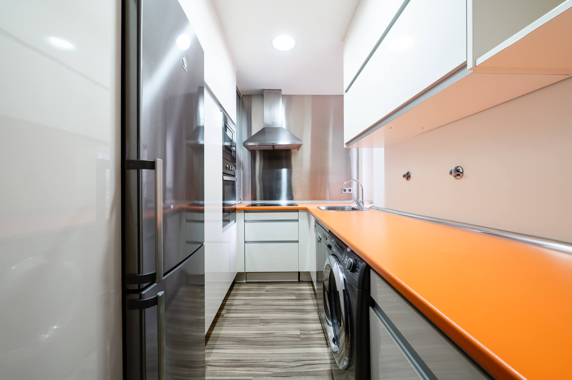 La cocina está completamente equipada con electrodomésticos, entre los que se incluyen nevera, congelador, horno, microondas, lavadora y lavavajillas.