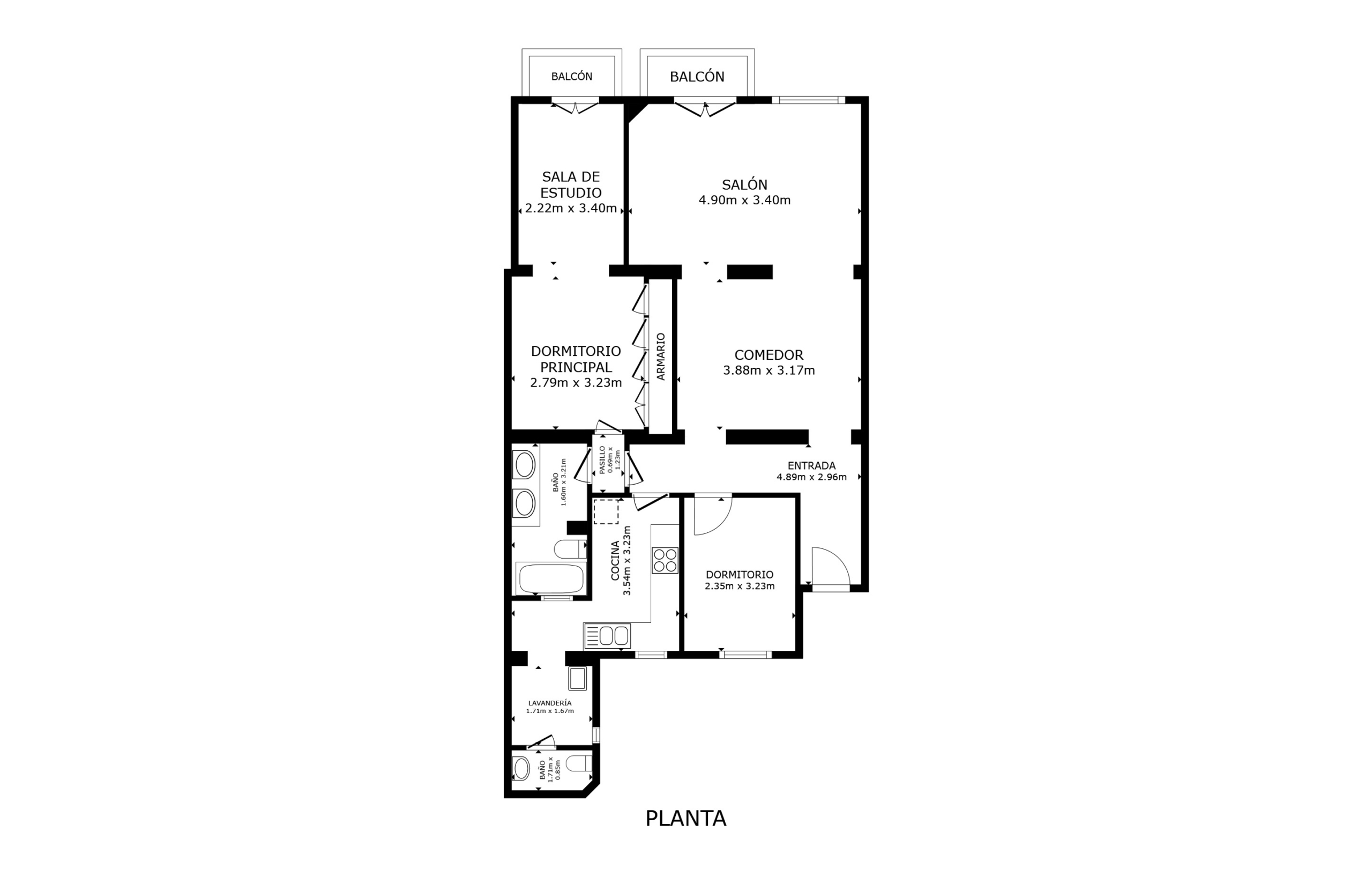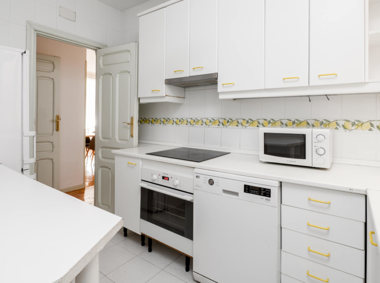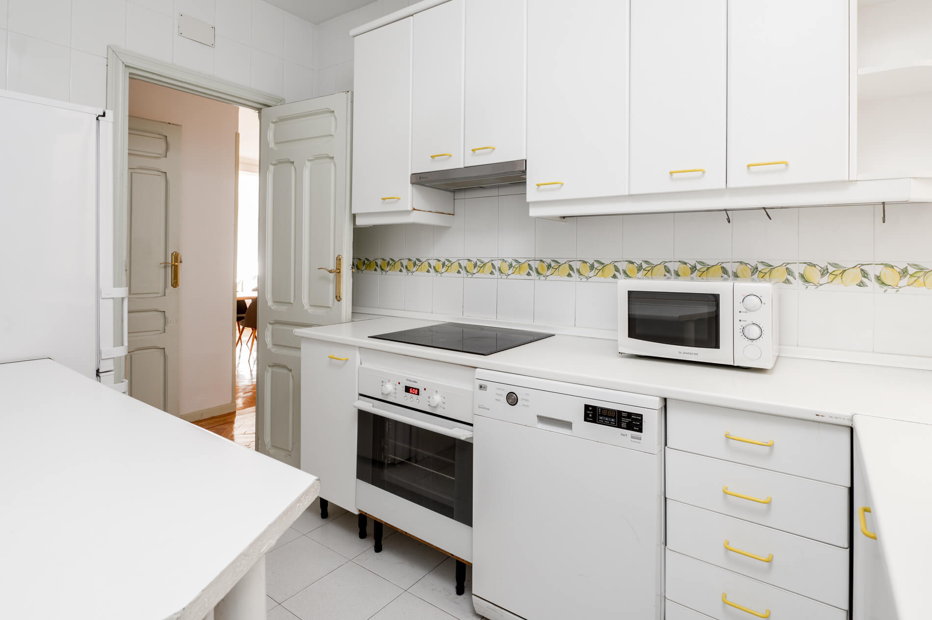 El piso cuenta con dos dormitorios, un baño completo y un aseo. Dispone de un amplio salón y comedor, además de una cocina equipada con nevera, congelador, horno, microondas, lavadora y lavavajillas. También cuenta con un área de lavado independiente y aire acondicionado en el dormitorio principal.
